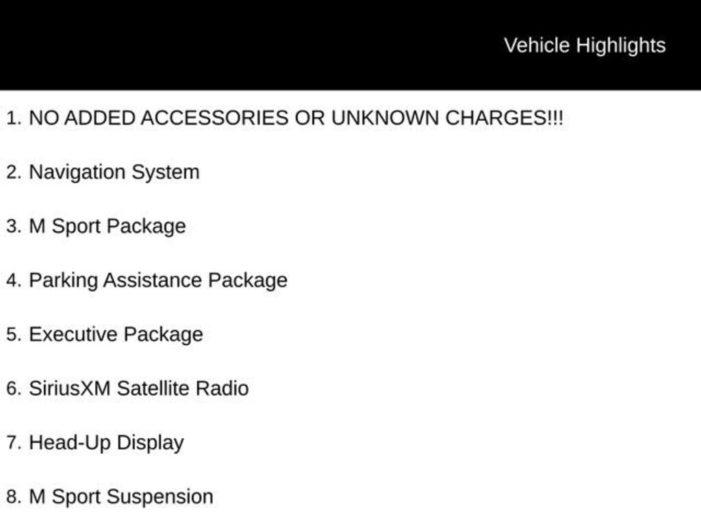 Recent Arrival! NO ADDED ACCESSORIES OR UNKNOWN CHARGES!!!, Active Park Distance Control, Adaptive Full LED Lights, Aerodynamic Kit, Automatic High Beams, Enhanced USB & Bluetooth (ZEB), Executive Package, Gesture Control, Head-Up Display, Heated Front Seats, LED Fog Lights, M Sport Package, M Sport Pkg, M Sport Suspension, M Steering Wheel, Navigation System, Parking Assistance Package, Parking Assistant Plus, Power Rear Sunshade, Power Tailgate, Rear-View Camera, SensaTec Dashboard, Shadowline Exterior Trim, SiriusXM Satellite Radio, Soft-Close Automatic Doors, Surround View w/3D View, Wheels: 19 x 8 M Double-Spoke (Style 664M), Wireless Charging, Without Lines Designation Outside. 22/29 City/Highway MPG Odometer is 20158 miles below market average!